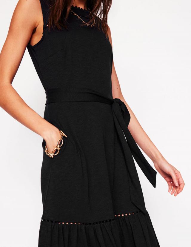 Our sleeveless Mila dress is all about the details (pom-pom trim to be precise). It also has a tiered maxi-length skirt and a waist-defining belt.- Model is 5’9 wearing a size 6R – 50% cotton 50% TENCEL Modal – Machine washable – Fit and flare – For a flattering shape – Designed to be maxi length, falling at your ankle – Side pockets – This garment contains TENCEL fibers. TENCEL is a trademark of Lenzing AG D1219-BLK