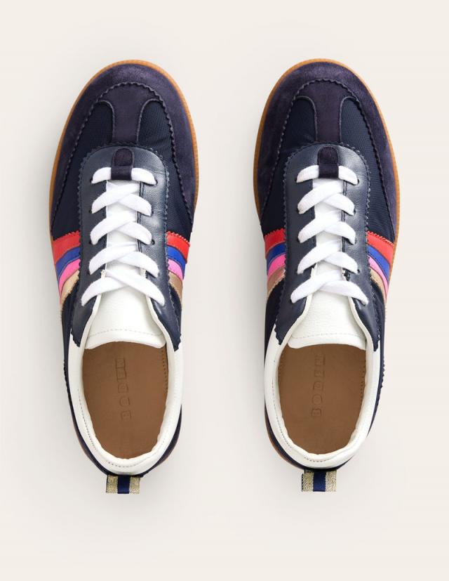 These everyday trainers have a playful retro vibe with pops of colour. Don’t worry though, the ‘tennis’ part of ‘tennis trainers’ is totally optional.- Model is 5’9 wearing a size 39 – SLV: upper metallic coated leather – DEN: upper textile – LEO: upper hair on cowhide – NVY: upper leather and textile – Other colours: upper suede and leather – Insock and lining textile and leather – Sole man-made A1294-NVY