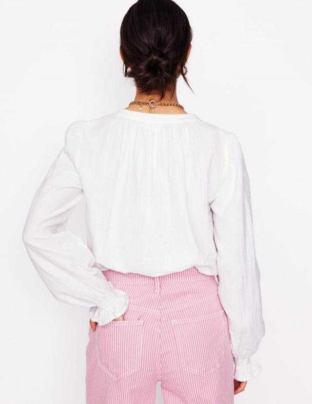Jeans, trousers, skirts, shorts or even swimwear, there’s nothing our Evie top won’t go with. It’s made from two layers of crinkled cotton and shaped with blousy sleeves and a buttoned front.less – Model is 5’9 wearing a size 6 – WTH: main 100% cotton, embroidery 100% polyester – PNT: main 100% cotton, embroidery 100% polyester – WHT: main 100% cotton, embroidery 100% polyester – Other colours: 100% cotton – BBL: 100% cotton – Machine washable – Relaxed – Easy shape but not too loose – Designed to fall between the waist and hip T1751-WIT