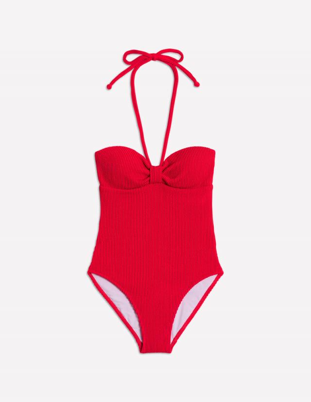 Maximise style and minimise tan lines with this swimsuit. Its halterneck can be easily adjusted or untied for a versatile look, while the crinkly texture adds retro playfulness.less – Model is 5’9 wearing a size 6 – Cup 100% polyurethane, Main 91% recycled polyester 9% elastane, Lining 100% recycled polyester – Machine washable – Lightly padded fixed cups for a smooth shape – Detachable strap – This fabric passes testing to UPF50+, protection is only provided on areas covered by fabric, you should still wear SPF sunscreen. Protection may also be reduced when wet or stretched S0395-RED