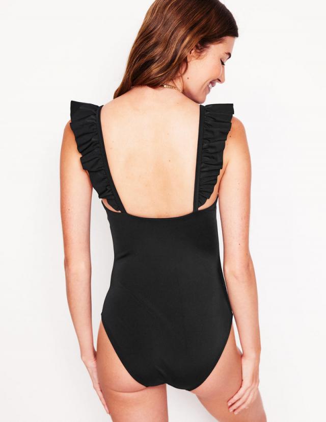 Packing for your upcoming exotic holiday Our Evia swimsuit will look right at home thanks to its ruffle detail along the V-neck and straps. The prints are pretty stand-out, too.less – Model is 5’9 wearing a size 6R – Cup 100% polyurethane, Main 80% recycled polyamide 20% elastane, Lining 100% recycled polyester – Machine washable – Lightly padded fixed cups for a smooth shape – This fabric passes testing to UPF50+, protection is only provided on areas covered by fabric, you should still wear SPF sunscreen. Protection may also be reduced when wet or stretched S0401-BLK