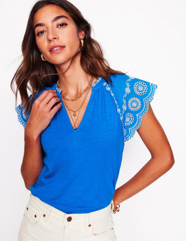 The breezy Ila cotton top is spliced with broderie blouson trims that give it an airy, elevated feel.- Model is 5’9 wearing a size 6 – 100% cotton – Machine washable – Straight – Regular easy shape but not too tight – Designed to fall between the waist and hip T1744-BLU