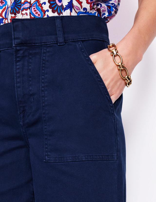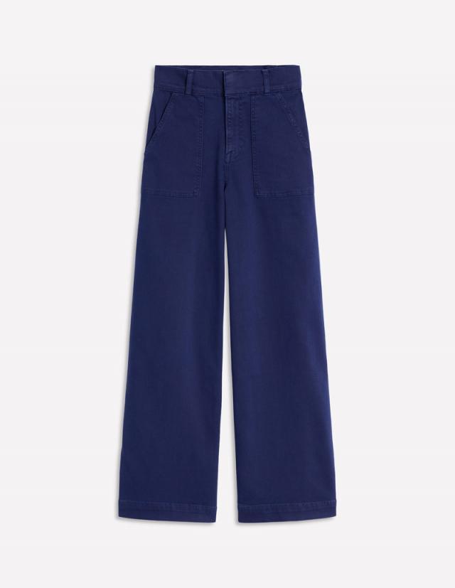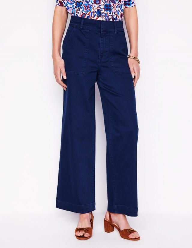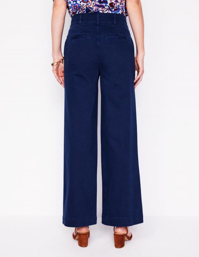 Spun from cotton with a hint of stretch, these wide leg trousers are a wear-anywhere staple. The office, errands or a Sunday stroll – you’ll reach for these time and time again.less – Model is 5’10 wearing a size 8 – 98% cotton 2% elastane – Machine washable – Inside leg length Regular 30½”/77.5cm – Sits at natural waist – Wide leg – Slim through the hip and thigh, with a wide leg – Designed to be full length with flats – Concealed hook and bar fastening at centre front waist with zip fly R0601-NAV
